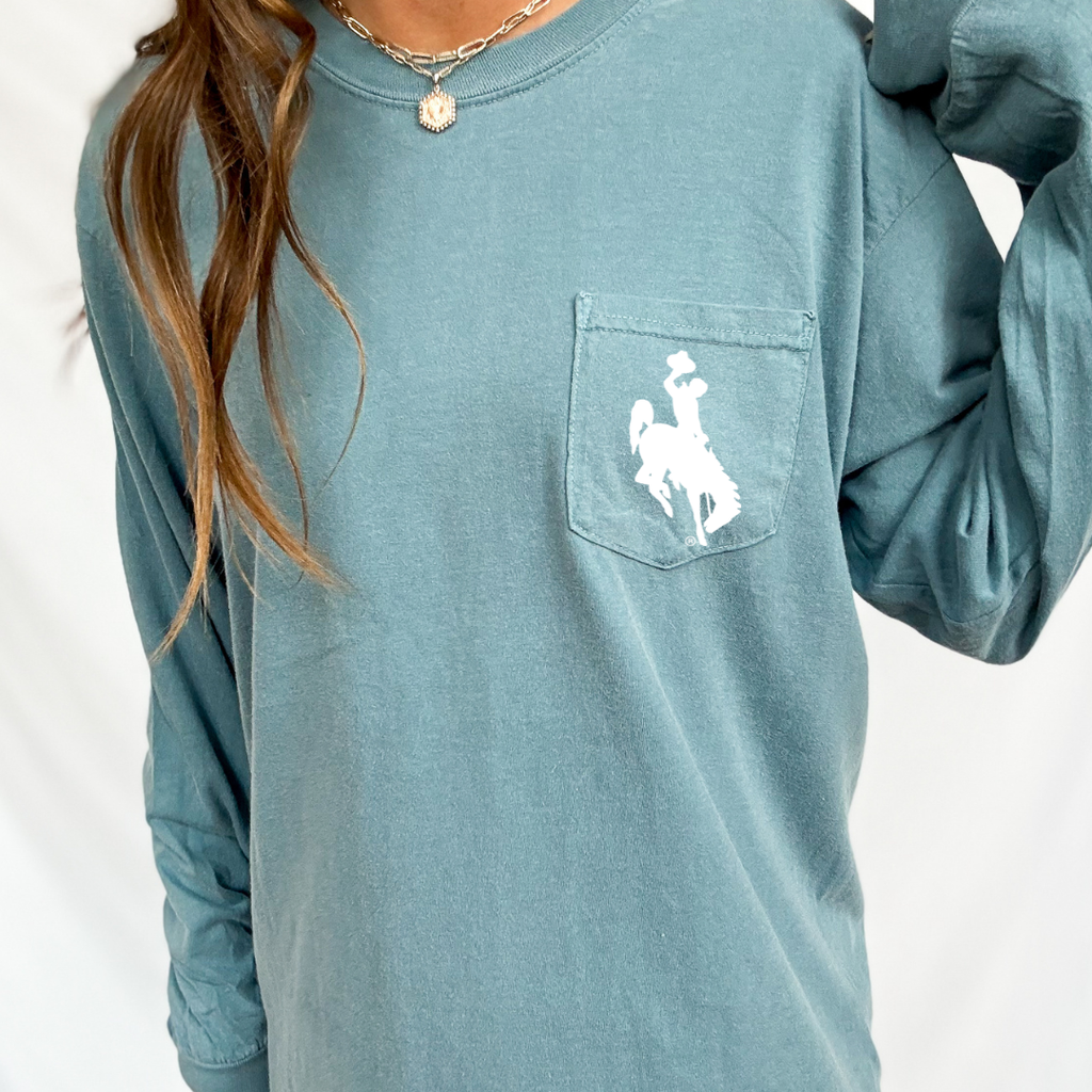 Ice Blue LONG Sleeve POCKET/ White Steamboat Comfort Colors Tee
